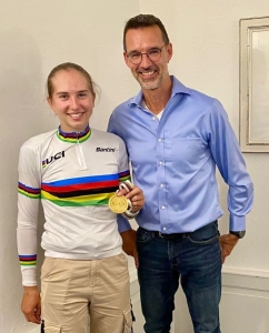 Anina Hutter, unsere Sportpreisträgerin, war mit ihrem Vater und Trainer zu Besuch - nota bene als Weltmeisterin. Im Team-Wettkampf gewann sie in der Vorwoche Gold, und dies präsentierte sie uns am Meeting, das Regenbogen-Trikot als Weltmeisterin inklusive. Sie stand Schampi ausführlich Red und Antwort und gab Einblick in ihr Sportlerleben als Langläuferin und Bikerin, sowie den Alltag zwischen Lehre und Training.